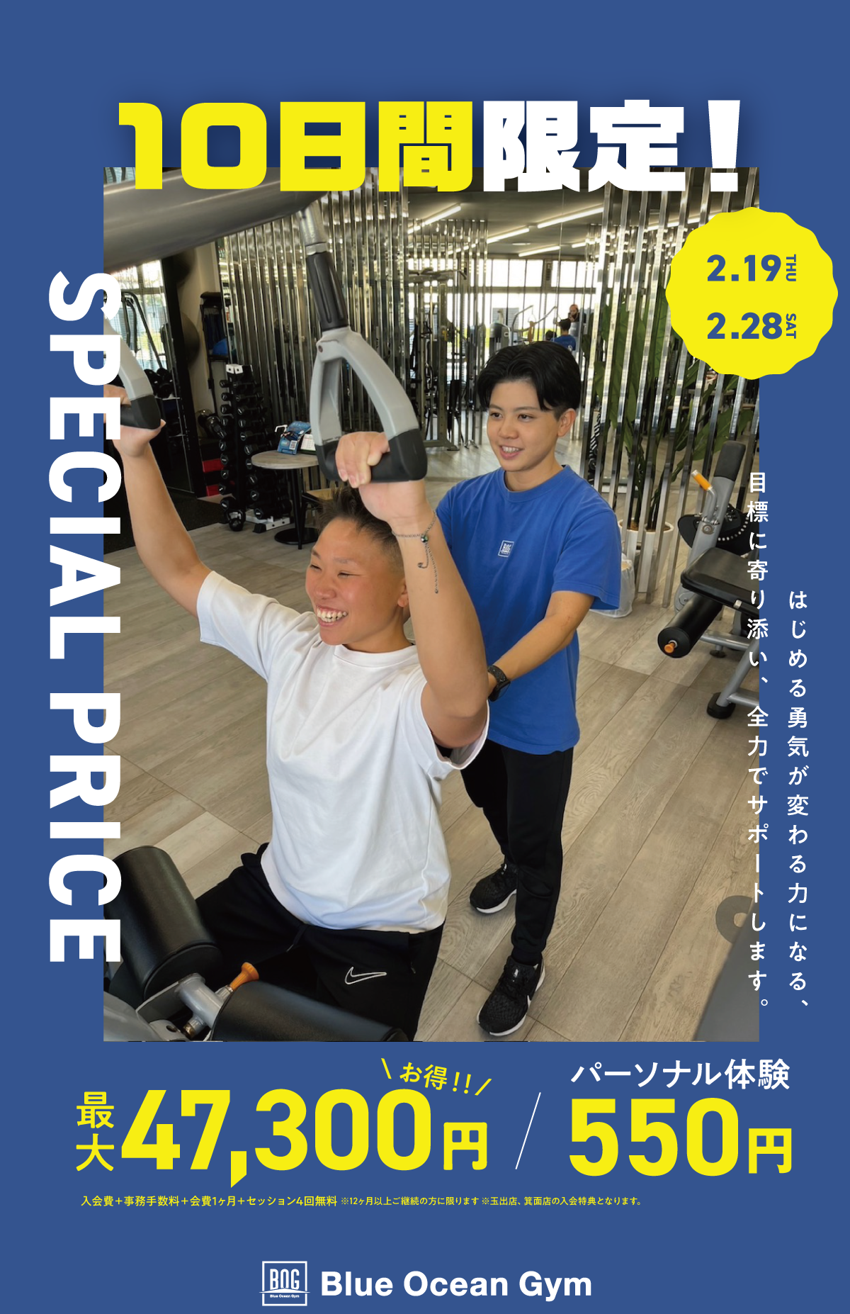 入会金/事務手数料/会費1ヶ月/セッション4回分が無料※神戸店は体験即日入会で入会金/事務手数料/会費2ヶ月分0円となります。※初めてご利用の方のみ対象となります。※カウンセリング、トレーニング料金が含まれます※12か月以上ご継続の方に限ります。詳しくは各店舗にお問い合わせください。